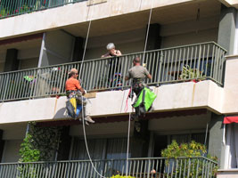 Pour lutter contre les effets de la rouille des ouvriers alpinistes traitent les ancrages de nos balustrades.)